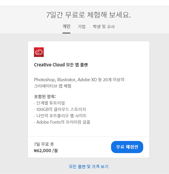 월 62,000원에 어도비의 모든 툴을 쓸 수있는 플랜인데..